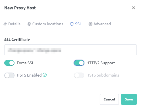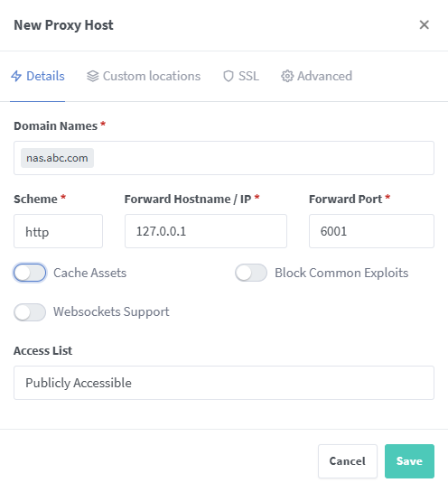 Hosts->Proxy Hosts->Add Proxy Host。Details 页: