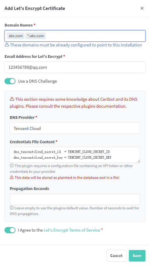 Use a DNS Challenge,选择你的 DNS 服务商(本次使用腾讯云,所以是Tencent Cloud)访问
